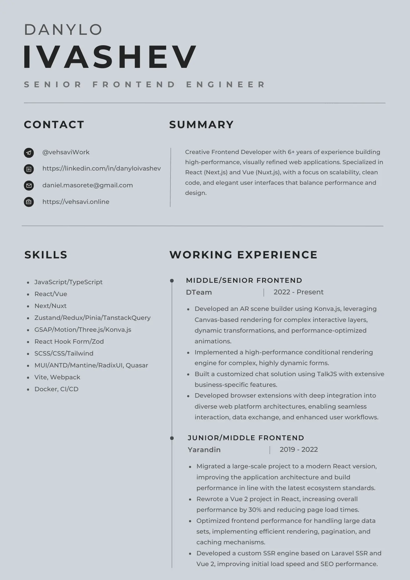 Creative Frontend Developer with over 5 years of experience crafting high-performance, visually polished web applications for clients ranging from global logistics companies to individual startups. I specialize in React (Next.js) and Vue (Nuxt.js), focusing not only on speed and scalability but also on clean, readable code and refined user interfaces. I believe that great software is both beautiful and maintainable — performance and elegance should go hand in hand.
