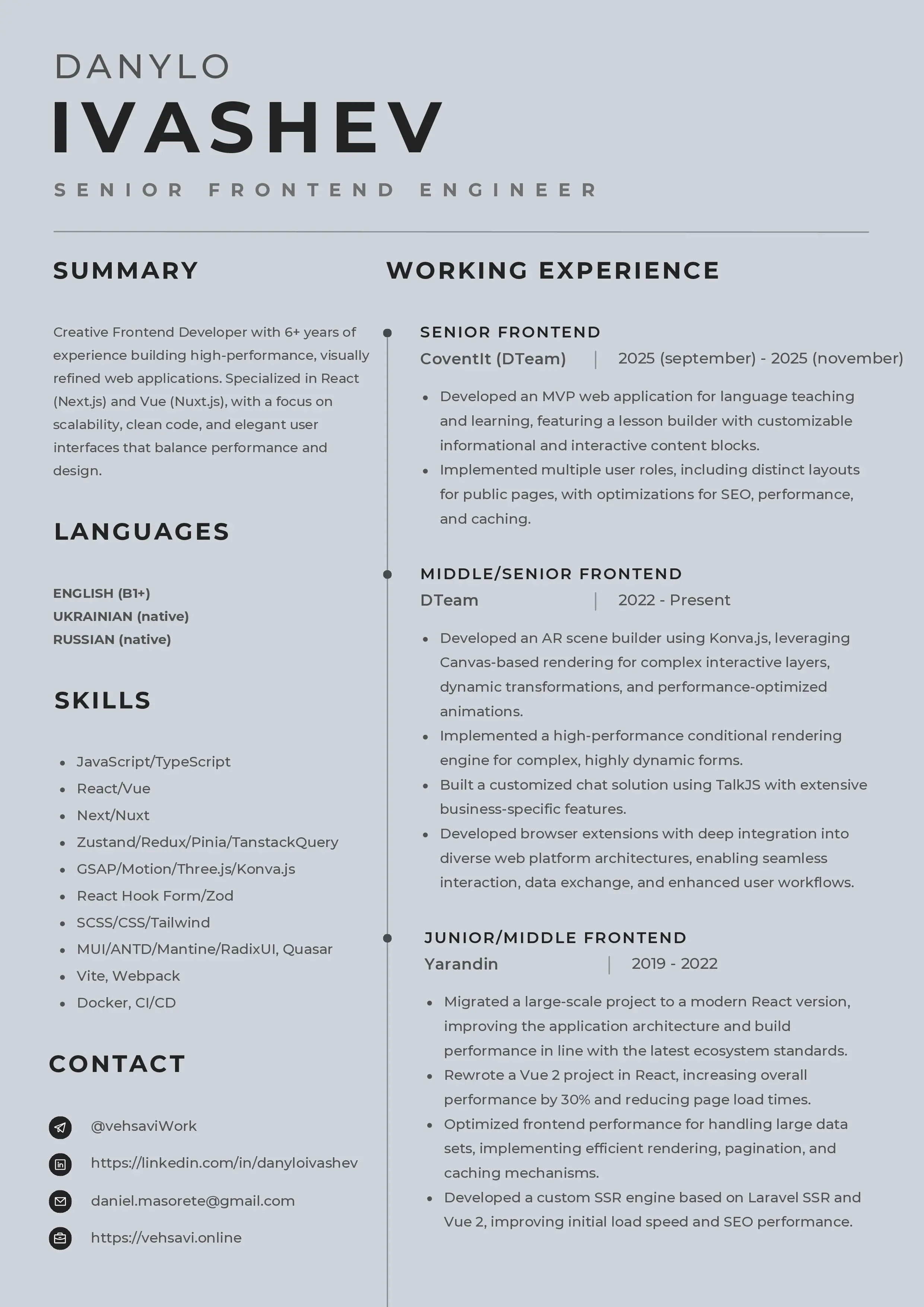 Creative Frontend Developer with over 6 years of experience crafting high-performance, visually polished web applications for clients ranging from global logistics companies to individual startups. I specialize in React (Next.js) and Vue (Nuxt.js), focusing not only on speed and scalability but also on clean, readable code and refined user interfaces. I believe that great software is both beautiful and maintainable — performance and elegance should go hand in hand.